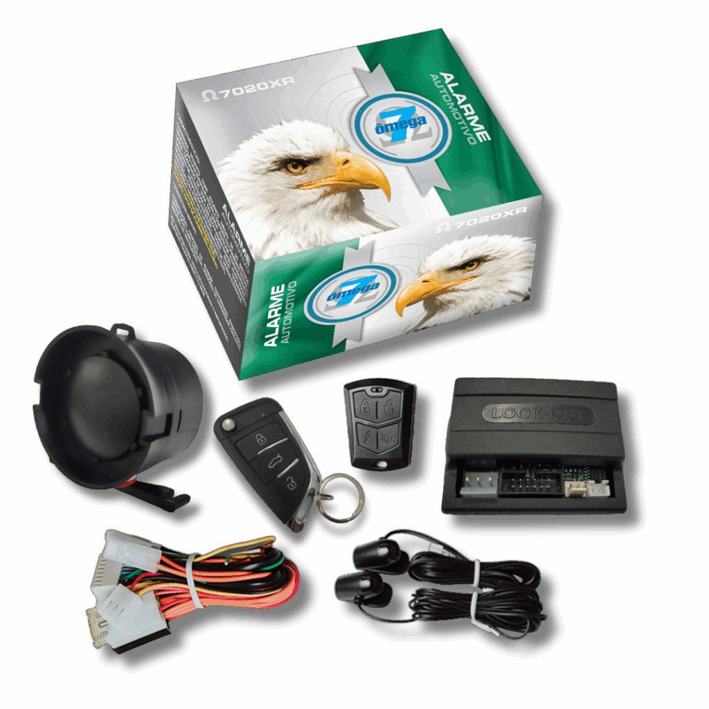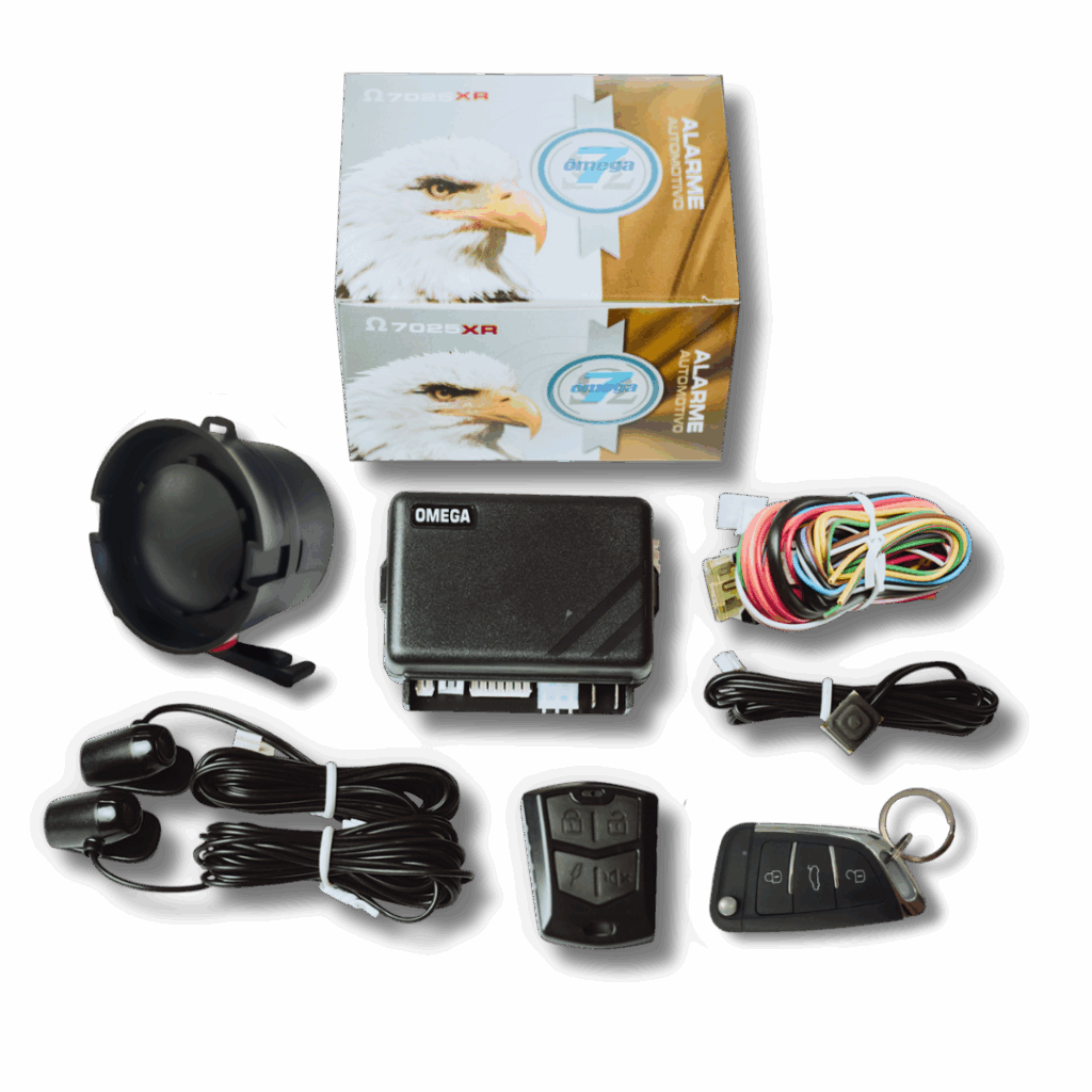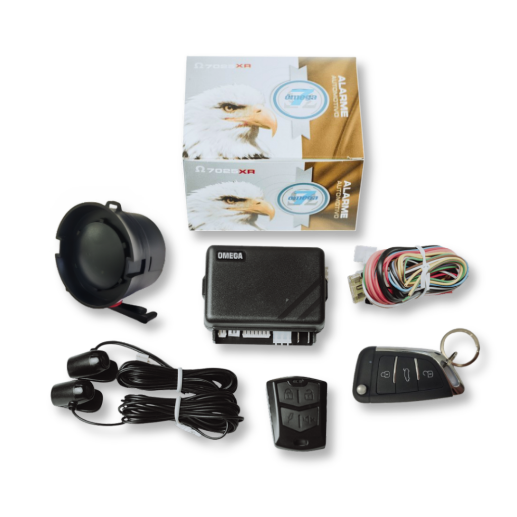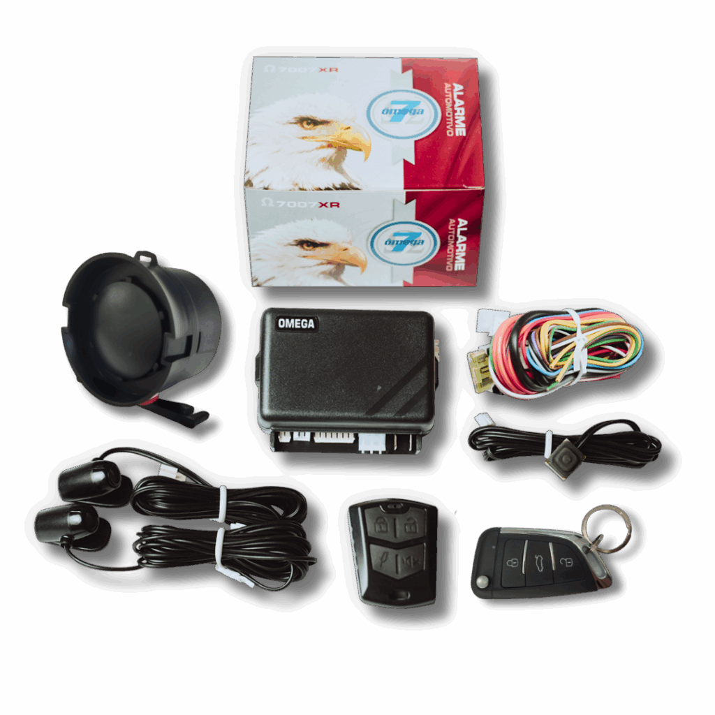 Sistema de alarme antifurto configurável para veículos automotivos de qualquer marca e modelo. Acompanha um controle modelo XR e um controle modelo canivete, sirene, chicotes de instalação e sensores de ultrassom